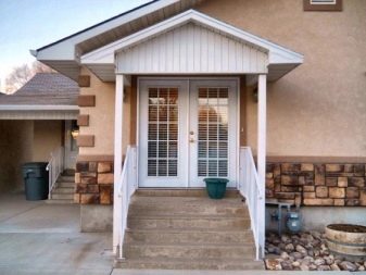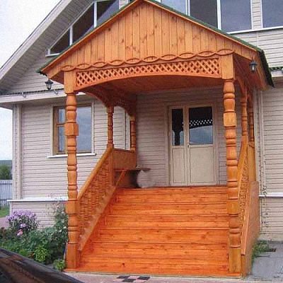 Разширението към самата къща изглежда различно. Това може да бъде ниска конструкция с няколко стъпала, разположена близо до къщи без мазе, или също толкова проста, но вече висока веранда с парапет.. Когато пространството близо до вратата остане отворено без никакви ограничения, то се превръща във вътрешен двор, но стените вече са характерни за верандата. Има и опция за тераса – открита голяма площ, оборудвана с парапети. Козирката може да бъде монолитна, тоест комбинирана със стената, или може да бъде разглобяема модулна конструкция.
