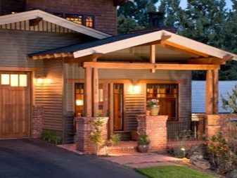 - За да придадете на дома си модерен вид, идеална е обикновена веранда без парапети и стъпала с прав правоъгълен балдахин. Разбира се, тази опция е възможна само при липса на сутерен. Земята близо до верандата е оградена с плоски декоративни камъни, а цялата конструкция е осветена от чифт модерно изглеждащи стенни лампи..