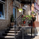 - Класическа пристройка с коване и сенник от поликарбонат може да играе по нов начин благодарение на допълнителния сенник над стълбите. Тънките метални опори остават без допълнителни декорации, но дългите парапети, които се движат от двете страни на тухлените стъпала, са изобилно запълнени с елементи от ковано желязо. Поради факта, че верандата на къщата се различава по височина, беше възможно да се организира чифт цветни лехи отстрани на разширението, сякаш продължава конструкцията на вратата. За осветително тяло беше избрана улична лампа, монтирана над входа..