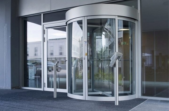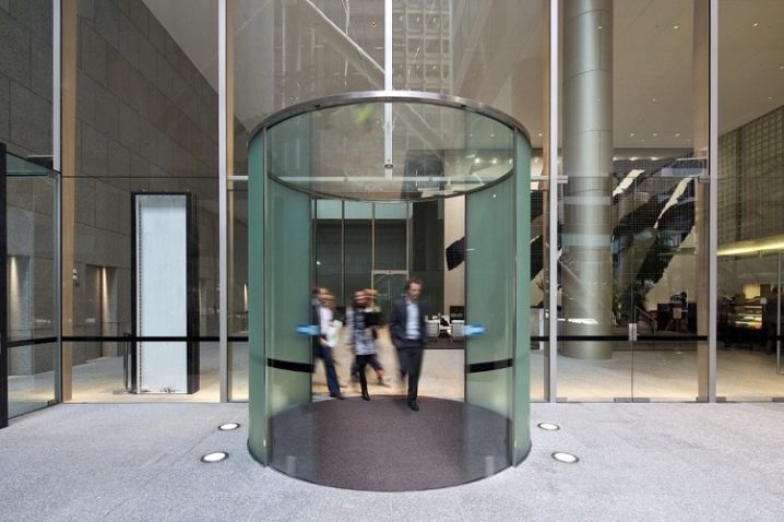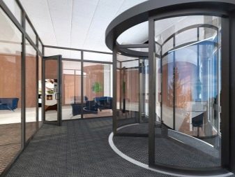- Въртящ се. Дизайнът прилича на въртележка. Системата има четири сектора, всеки от които е разделен от неразделна стъклена преграда. В този случай преградите се въртят около оста си. Въртящите се врати се използват за създаване на необходимия образ на сградата..