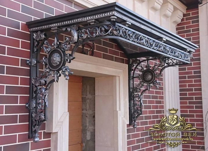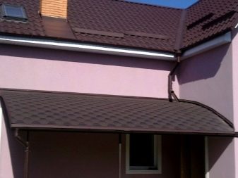 - Метални плочки. Става стилен материал, когато се използва правилно. Идеален за сгради в готически стил. Освен това такъв навес ще ви служи вярно много дълго време: материалът е устойчив на износване, устойчив на температурни крайности и има ниско тегло. Единственият минус е, че върху металната козирка звуците на дъжд или градушка ще се чуват като никой друг. Той също така се загрява бързо и може да се нагорещи отдолу през лятото, особено ако цветът е черен..