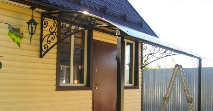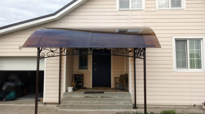 Сенникът над верандата е незаменима част от всяка сграда, било то частна селска къща или например веранда на магазина. Той предпазва от неблагоприятни метеорологични условия (дъжд и сняг), като не им позволява да легнат точно пред входната врата, ако е необходимо, можете да се скриете под нея и да изчакате лошото време. Най -простият и евтин вариант е козирка за навес. Такива шарки могат да се видят над входа на местния магазин за хранителни стоки. Козирката е универсален дизайн, който перфектно изпълнява своята функция и предпазва от всички горепосочени фактори.