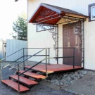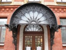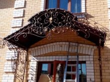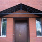 - Пример за козирка от ковано желязо за входа на жилищна тухлена сграда.