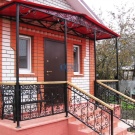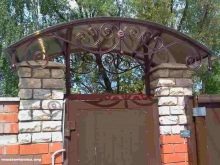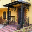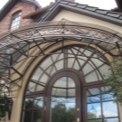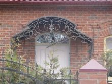 - Арочен козирка с коване под формата на растителни елементи, украсяваща входа на частна къща.