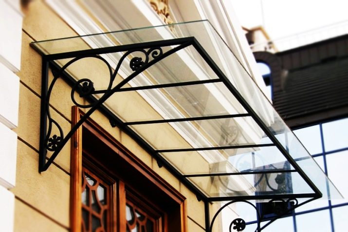 Стъклото се комбинира с коване в случаите, когато козирките са създадени по специален дизайн проект.. За да направите това, използвайте триплекс (закалено стъкло с полимерен междинен слой), който е естетически привлекателен, но нестабилен за значителни ударни натоварвания. Предимно се напуква, вместо да се натроши на малки парченца..