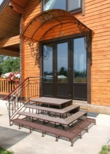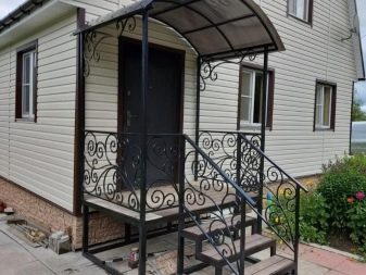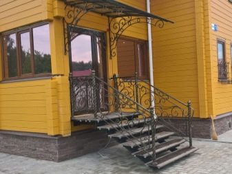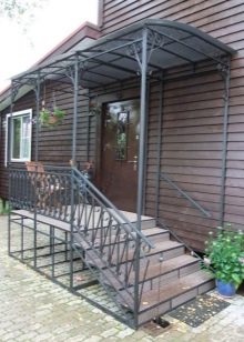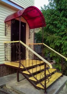 Друг недостатък на метала е контактът с вода. Металът трябва да бъде защитен чрез лакиране или тониране. Антикорозионният материал може да бъде избран веднага. Е, ако, както в този случай, това е стълбище към верандата, можете да помислите за обемна козирка, която ще се превърне в сенник над стълбите. Той ще защити напълно или частично конструкцията от валежи.