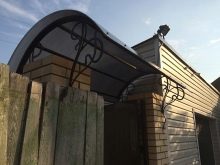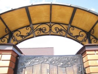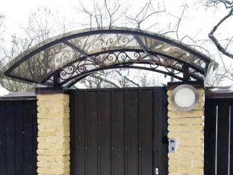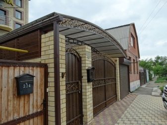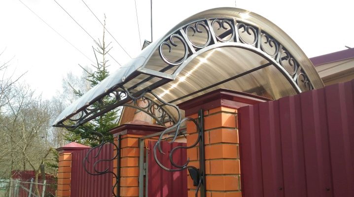 В местните географски ширини дъгообразният тип навес е най -предпочитан. Това е метална рамка, украсена с коване, и настилка от същия поликарбонат – най -популярният вариант днес..
