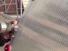 - Поликарбонатът може да бъде нарязан по време на фиксирането, за да се предотврати това, материалът се освобождава от защитното фолио само след монтажа.