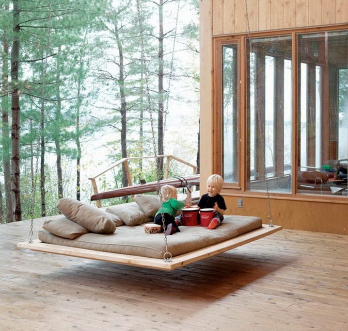 За селска къща или лятна вила има други възможности за люлки. Такава конструкция може да бъде прикрепена към гредите на закрито или по желание да се пренесе в градината или верандата. Такова легло ще създаде елемент на безтегловност и ще добави екстравагантност към интериора. Детето ще хареса такова необичайно нещо, но си струва да запомните правилата за безопасност. Със своя люлеещ ефект леглото ще осигури здрав и надежден сън на вашето бебе.