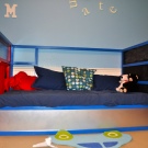 - Harnosand 1 е изработен от масивен бор, допълнен с възглавници с полипропиленов пълнеж. Темата на интериора на детето може да бъде лек шезлонг с мека постелка. При употреба той е стабилен, издръжлив, лесен за съхранение.