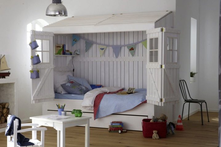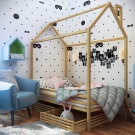 Интересното е, че най-бюджетният вариант за бебешко легло под формата на къща е и най-практичен и функционален. Децата растат бързо, вкусовете им се променят често и на родителите не е лесно да следват желанията си. Тук малка къща, комбинирана с двуетажно легло, се превръща в спасител. Свободното пространство в долната част и оградите отгоре могат лесно да се трансформират в кораб, магазин, автобус, замък, хижа, самолет или пиратска бърлога с помощта на платове с тематична апликация или стилистично проектирани висящи конструкции.
