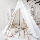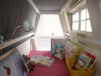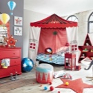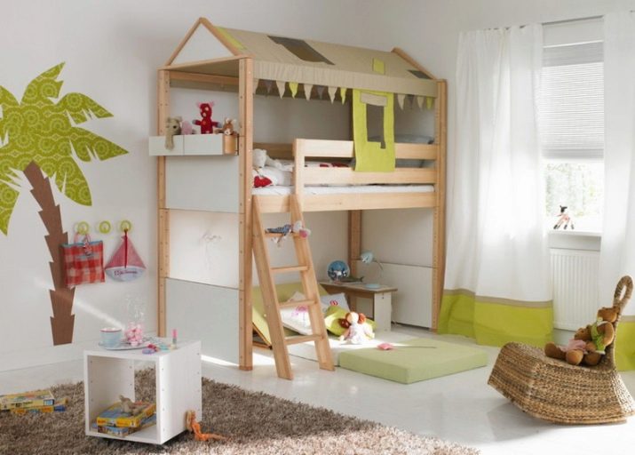 Мекото легло на такава детска спалня, подредено на пода или на нисък пиедестал, е безопасно и достъпно за дете на всяка възраст и почти напълно елиминира всяко нараняване. В допълнение, тъканите стени на леглото на хижата могат да скрият в себе си изобилие от джобове, пълни с всякакви неща, и вентилационен прозорец в света на мечтите и завеси от слънцето, които пречат на съня рано сутрин, и банална, но понякога толкова необходима мрежа против комари,