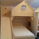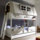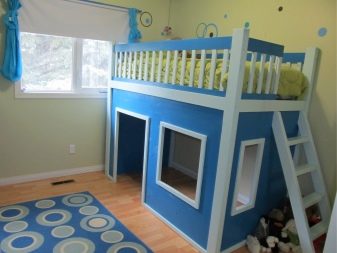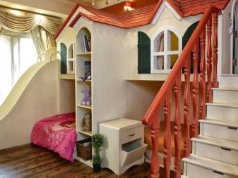 Неспокойните любители на височините и привържениците на спортен начин на живот със сигурност ще предпочетат легло с къща на горния етаж – под формата на таван. Обикновено дизайнерите по този начин имитират наблюдателна палуба, корабна палуба или къща на дърво. Често такава таванска къща се комбинира не само с легло, но и с детска площадка и с различни спортни уреди, подлежащи както на юноши, така и на малки деца от 3 години (в зависимост от избраната конфигурация). Можете да се изкачите дотам с помощта на стълба с парапети, здраво въже или надеждна мрежа за „риболов“ и да слезете по „огнен“ стълб, въжена стълба или пързалка, обожавана от всички деца..