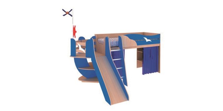 Има опции, когато можете да влезете в таванското помещение над леглото или по шведските стълби, или чрез напълно безопасни широки стъпала под формата на просторни чекмеджета, където детето с удоволствие поставя личните си вещи, играчки и спортно оборудване.