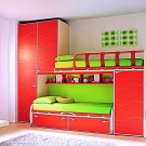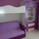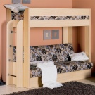 Тази опция е идеална както за момичета, така и за момчета. Ярките цветове добавят светлина в стаята, а собствениците й получават добро настроение. На първото ниво има трансформиращ се диван, който в разгънато състояние се превръща в истинско двойно легло.