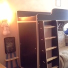 Двуетажен спален комплекс от този тип ви позволява да поставите различни рафтове с книги или играчки над дивана, които винаги ще бъдат под ръка.
