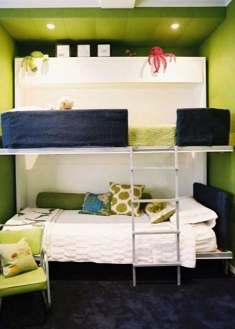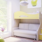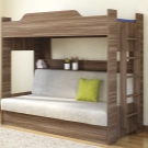 Двуетажно легло от този тип също е отлично решение за собствениците на едностаен апартамент, където не е възможно да се постави място за спане за родители и дете. По този начин горното ниво под формата на редовно легло е детска зона за спане, а сгъваемият диван в долната част е идеален за родителите..