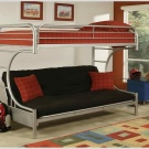 Двуетажно легло с диван, направено от метал, също има място, но е по -малко популярно от предишните модели. Много родители отказват метални легла, считайки ги за опасни за децата. Металът е травмиращ материал и неспокойните, активни деца могат лесно да се наранят, докато играят на леглото..