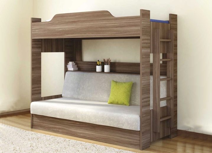 Тази версия на двуетажно легло се счита за най -практичната. Ако цените свободното пространство и искате да направите стаята на децата си по -просторна, тогава двуетажно легло с разтегателен диван отдолу е най -подходящият вариант за вас. През деня първото ниво ще служи като място за почивка, където можете да седнете и да гледате телевизия, а вечер диванът може да бъде разширен и превърнат в двойно легло.