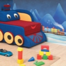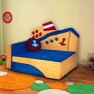 - Превозно средство. Такива модели изглеждат много интересни. В стаята на момчето можете да поставите ъглов диван във формата на кораб, кола или влак. Те приличат на огромни играчки, имат декоративни елементи под формата на колела, волан и т.н. Често в такива конструкции има мека стена. Такива дивани ще ви помогнат да украсите детската стая в същия стил, например морски или автомобилен.