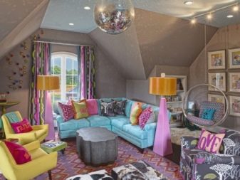 Вертикалните завеси с печат визуално ще направят стаята да изглежда по-висока, а топка лампа в стил диско ще добави динамика. Тази опция е добра за стая с первази, ниши, нестандартни стени и тавани..