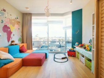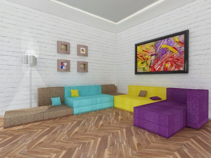- Диван модул. Той се формира от съставните му части или модули. Всеки такъв сегмент може да бъде боядисан в различни цветове, което ще зарадва детето. Плюс това, интериорът на такава детска стая е лесен за промяна чрез промяна на местоположението на сегментите и приспособяването им към стаята..