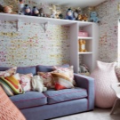 Гардероби и рафтове в ъглите на стаята ще се превърнат в място, където една млада дама ще подреди своите книги, сувенири, играчки. Стените могат да бъдат украсени с фотографии, играчки с висулки.