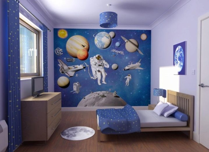 Темата за космоса ще се превърне в универсален стил. Звездите и планетите, изобразени на тапета, ще привлекат вниманието ви. Най -добрият вариант тук биха били светещи модели..