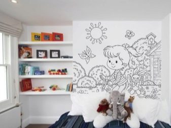 Опциите за бюджетен тапет за рисуване включват хартиени тапети за оцветяване.. Детето може да рисува върху тях с обикновени и восъчни моливи, флумастери и цветни химикалки. Препоръчително е да използвате такива тапети за деца с определени умения за рисуване и оцветяване, тъй като вече няма да е възможно да изтриете рисунка, която не е получена..