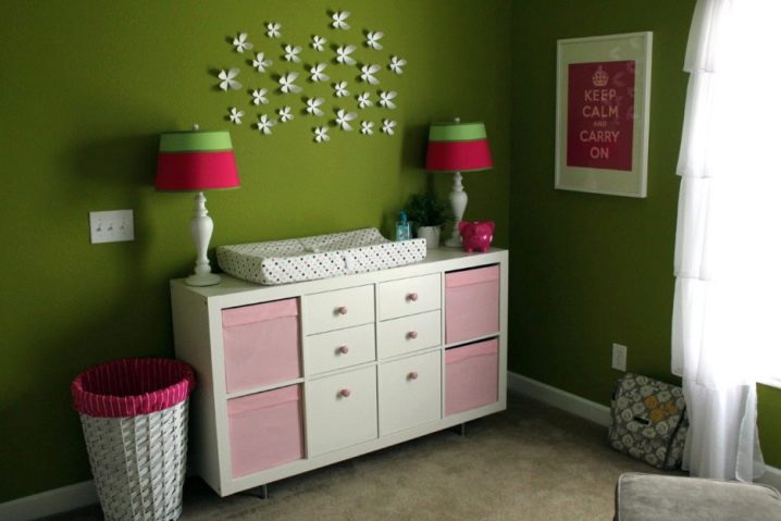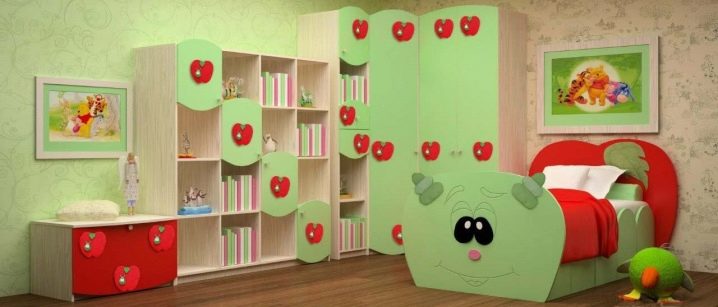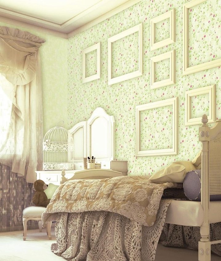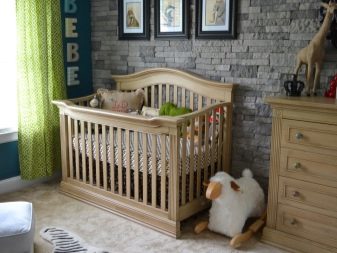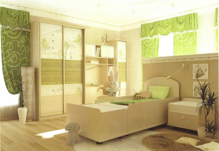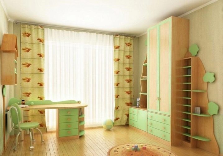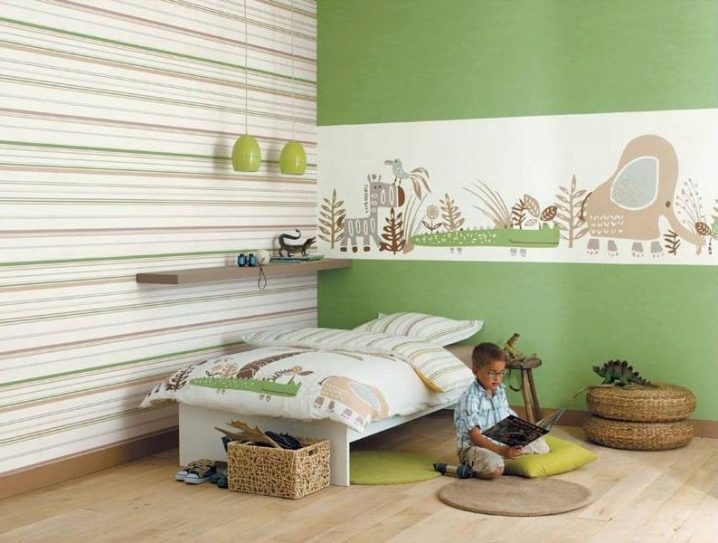 Говорейки за останалата част от дизайна на стената, зеленият тапет се откроява. Светлозелени и приглушени, но винаги светли цветове, те подобряват душевното състояние на детето и се комбинират с растителни и животински шарки.