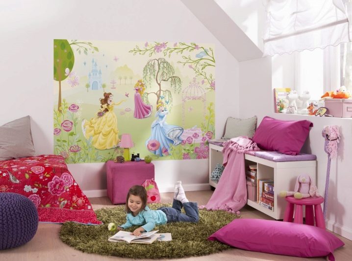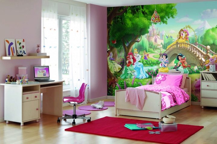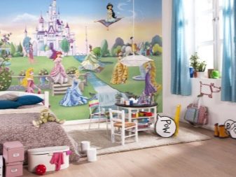 Продължавайки темата с момичешко послание, фототапетът и панелите с принцеси на Дисни се открояват ярко, защото момичетата ги обичат толкова много. Тук можете да срещнете и красивата Жасмин от Аладин, русокосата красавица Пепеляшка, Снежанка и невероятната красота от анимационния филм Красавицата и Звяра. Такава композиция в сини и розови тонове определено е достойна за отделна стена в детска стая..