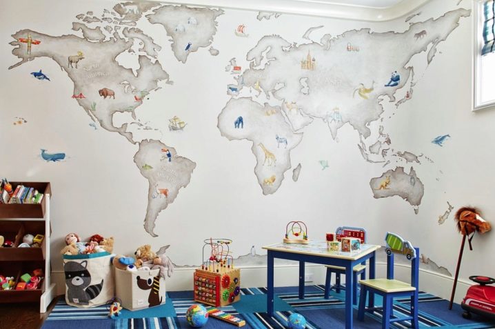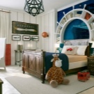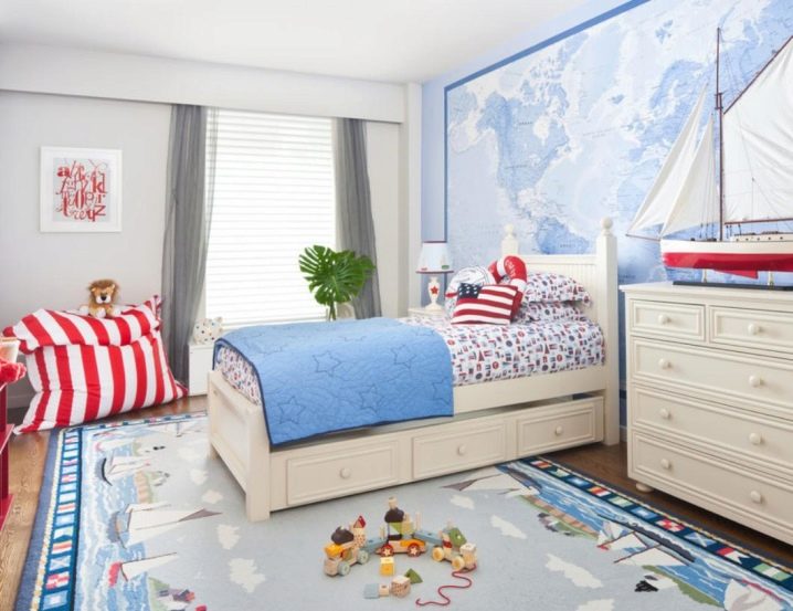 И ако стаята за момичета трябва да е удобна и спокойна, тогава душата на момчетата непрекъснато изисква откриване и игра. За този повод дизайнерите са подготвили тапети в морски стил. За ученика полезно и стилно решение ще бъде фототапет или панел с карта на света или съдържание..