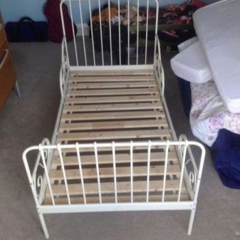 Също така, няма как да не споменем такъв известен вариант като леглото Minnen. Тя е изцяло метална и украсена с изящни вензели, които правят креватчето само по -красиво. Металните легла са много издръжливи и надеждни и се разгъват по -бързо и по -лесно..