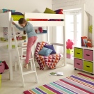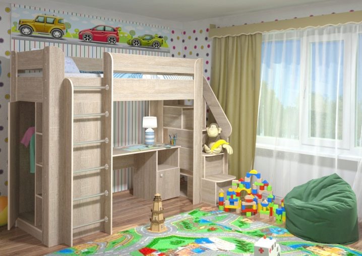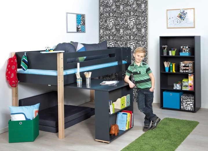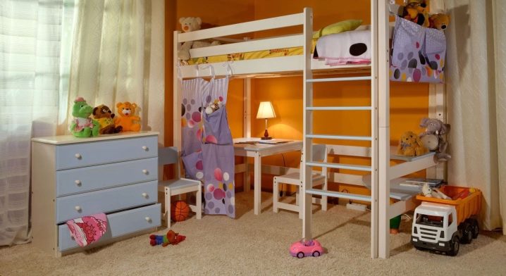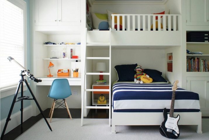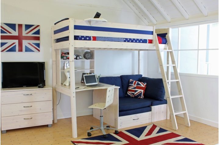 Сега производителите създават много модели тавански легла с две или повече функционални нива, всеки от които е отделна зона. Можете да изберете както мини модел за едно дете, така и голям комплект мебели за две деца. За едно дете по правило избират по -прост тип легло на таванско помещение с компактно легло на високи крака. Този дизайн има стълба отстрани, за да се изкачи директно до леглото. Мястото отгоре и отдолу на такъв модел е много лесно да се обзаведе самостоятелно, в зависимост от възрастта на сина или дъщерята..