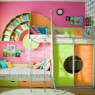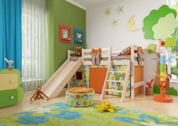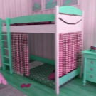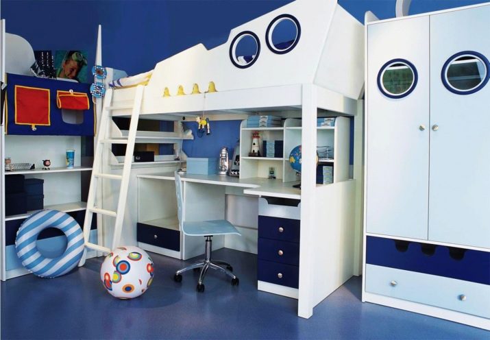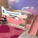 Обикновено такъв необичаен елемент като легло на таванско помещение оставя основата на интериора на детска стая, така че всички останали мебели и интериорният дизайн като цяло са подбрани в хармонични нюанси. Всички мебели в детската стая трябва да съставят хармоничен, но по -скоро ярък ансамбъл, така че детето да не се отегчава в стаята си. За момче е по -добре да изберете модел в по -ярки цветове, зелените, сините и червените цветове са идеални. Момчетата също ще оценят цветните ясли на таванско помещение, направени под формата на влак или кола.