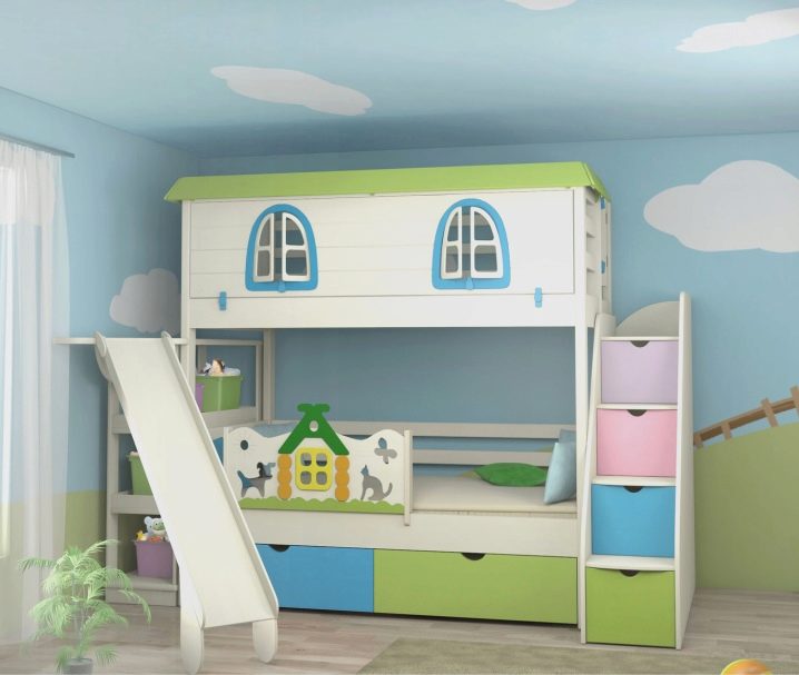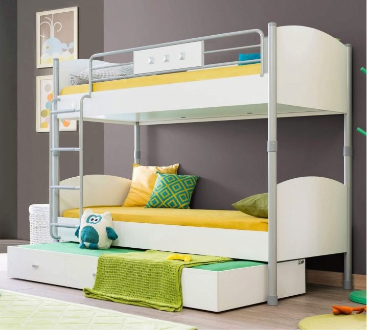 Таванското легло за две деца, в допълнение към няколко места за спане, е оборудвано с една голяма или две компактни маси за писане, а също така има необходимите рафтове за книги и гардероби за детски дрехи. Има и модели за писти за три деца, в които местата за легло са поставени на различни нива, ако къщата ви има достатъчно високи тавани. Алтернатива са моделите за три деца с едно или повече разтегателни креватчета, които могат да се прибират много компактно през деня, като обикновен чекмедже..