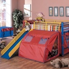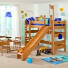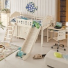 Друго любимо детско таванско легло е комбинацията от зона за спане и игра с пързалка.. В този случай детето ще може да кара пързалката у дома, в безопасност. Това е особено вярно, когато времето е лошо навън и няма възможност за разходка. Зоната за спане може да бъде разположена в горната част, така че сутринта бебето може да слезе за игри, след като се търкулна надолу по пързалката, а вторият вариант е местоположението на зоната за спане отдолу, където бебето ще се плъзне, като е играло достатъчно в зоната за игра. Освен това плъзгачът може да бъде както прав, така и отворен и дори затворен винт, който изглежда много интересен и необичаен..