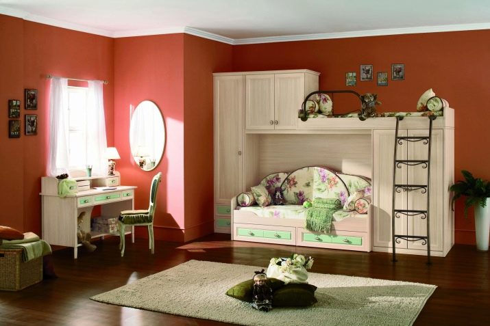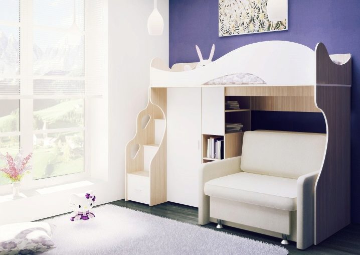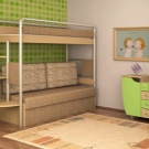 В допълнение към функцията за отпускане, диванът може да функционира и като допълнително легло. В допълнение, диванът в таванското легло може да бъде разширен, за да осигури още едно място за спане. Това е много удобно, с такова подреждане на местата за спане, можете много добре да спестите място в детската стая.