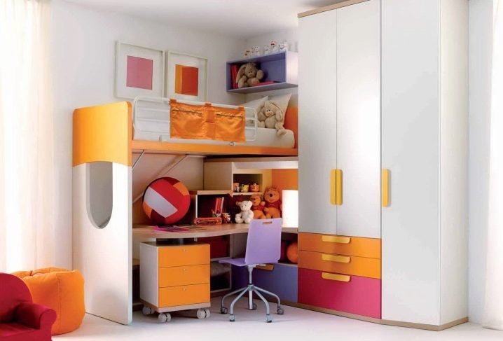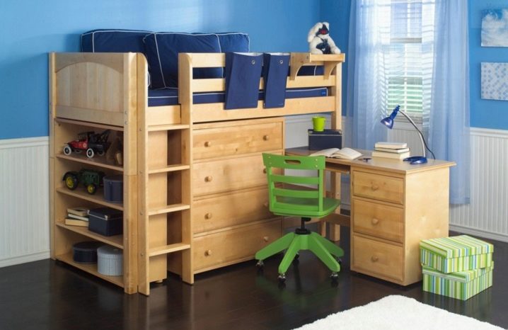 Ако самото легло е на високо ниво, тогава под него можете да поставите маса за компютър или уроци. Най -отгоре можете да подредите рафтове за книги или учебници. Най -добре е да закупите такива високи легла за дете над две години. В случай, че дизайнът на леглото е нисък, тогава в основата му можете да поставите шкафове, чекмеджета, рафтове, закачалки за детски неща и дори цял скрин.