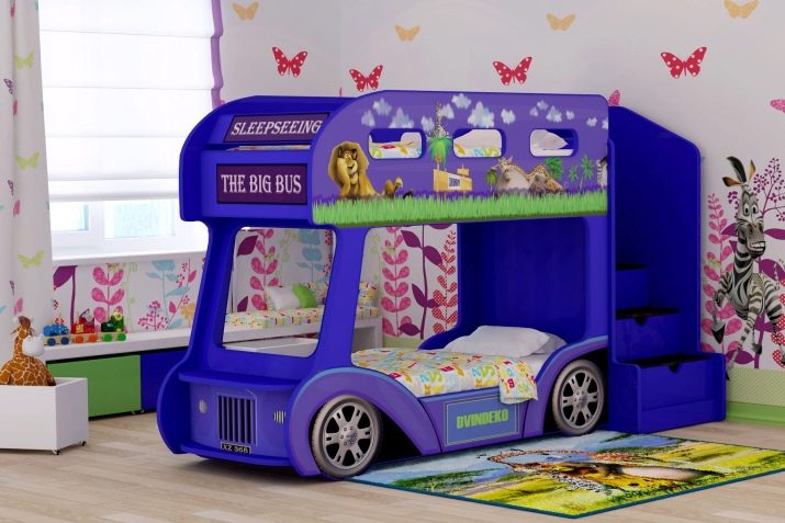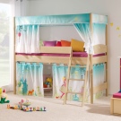 Таванското легло изглежда много добре, ако е декорирано в същата тема като детската стая. Освен това можете да дадете предпочитание на тема от приказка или карикатура. За момичета стаите с легло на таванско помещение, което е направено в нежни цветове, са по -подходящи. В този случай леглото може да бъде украсено със завеси или балдахин. Можете да украсите стаята с тапет с изображения на любимите герои на вашето дете и да украсите леглото на таванското помещение със същите играчки или стикери.