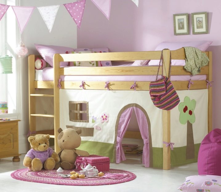 Можете също така да поставите любимите играчки на детето си в долната част. Под такова легло с достатъчно високи крака можете да поставите цяла зона за игри, както и хижа. За момиче можете да оборудвате къща за кукли в долната част на леглото. Малките деца обичат да разполагат с игрището до креватчето, тъй като бебетата ще имат възможност да заспиват до любимите си играчки..