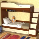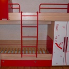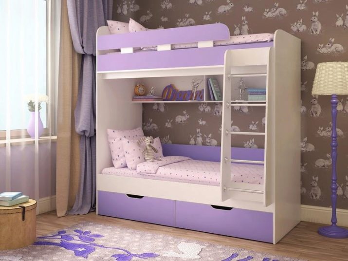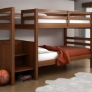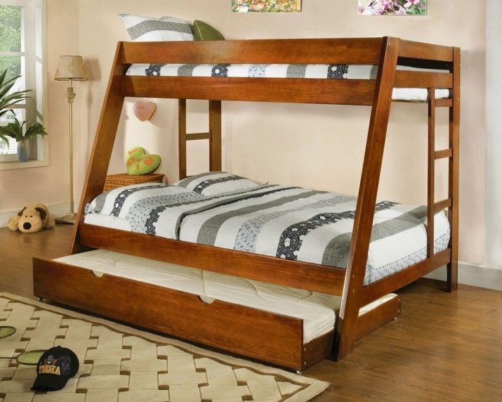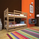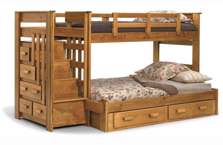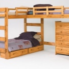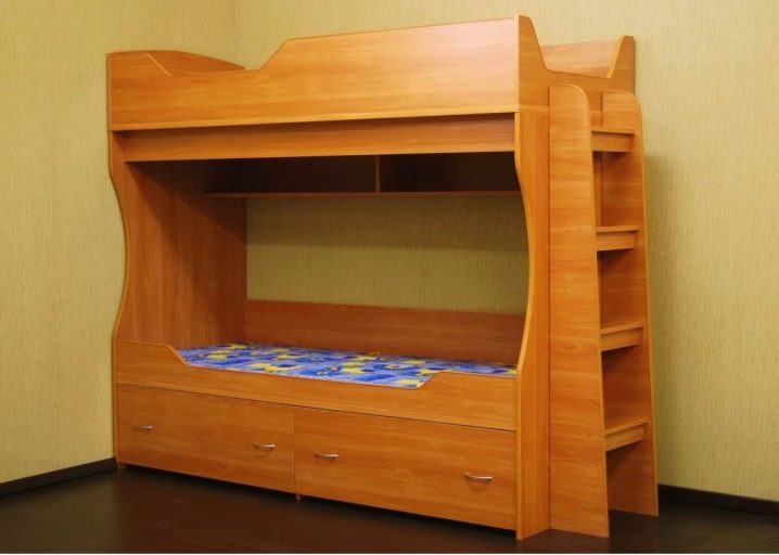 Долният слой на леглото също може да бъде оборудван със страна, например, подвижна. Леглото, което е от ПДЧ, е два пъти по -тежко от подобен модел, изработен от масивно дърво. Цената на такова легло обаче е пет или дори десет пъти по -малка от дървена..