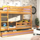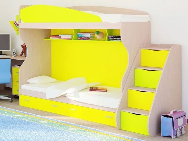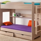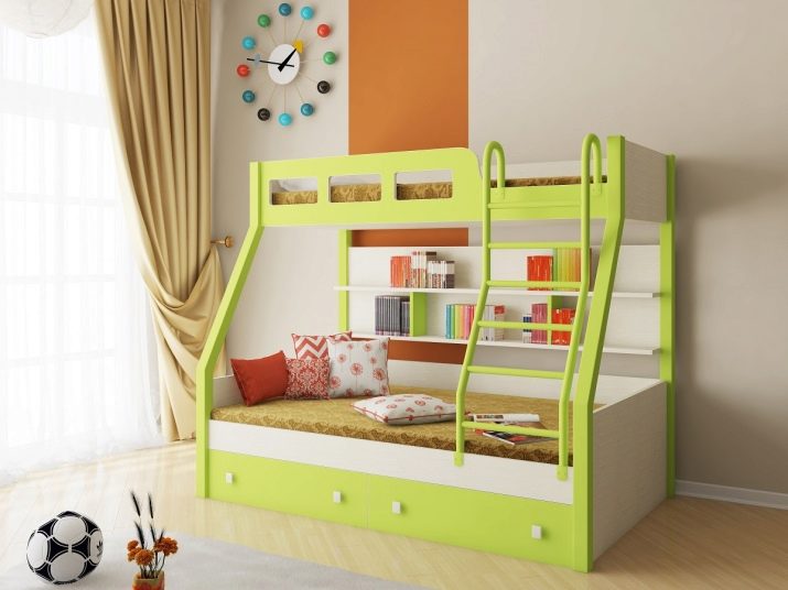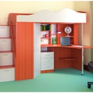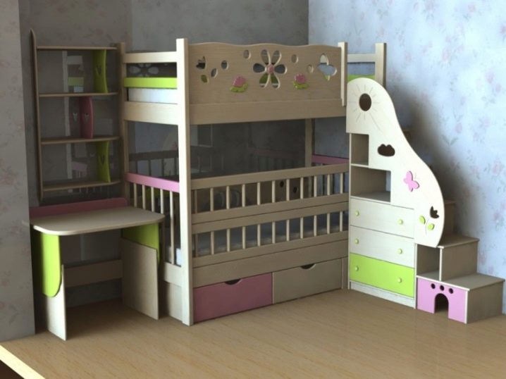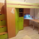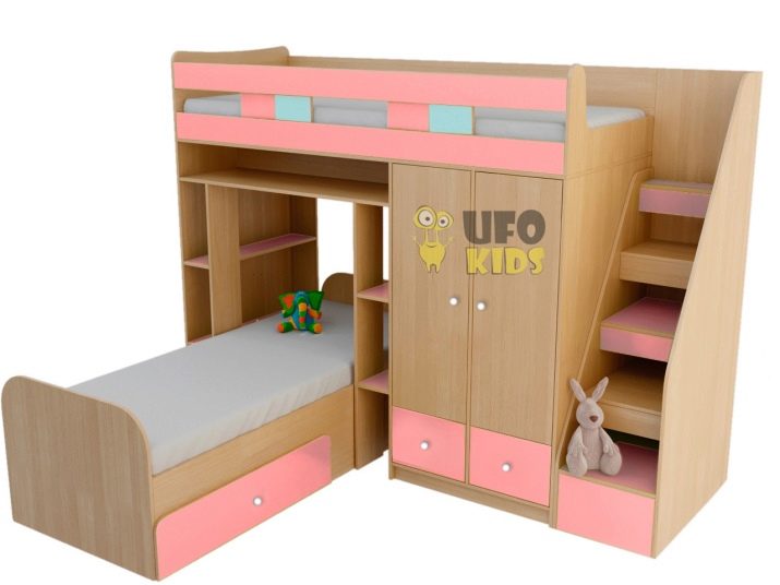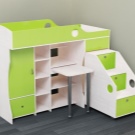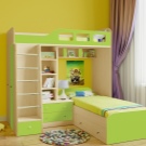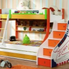 Друг вариант биха били леглата, когато по -долу има различни шкафове и рафтове, които помагат да се организира системата за съхранение на детски вещи и играчки. Тогава цялото останало пространство в стаята може да се използва за игри. Предимството на този дизайн е спестяването на пространство и семейния бюджет. Такова легло вече има рафтове за неща и бюро и място за писане..