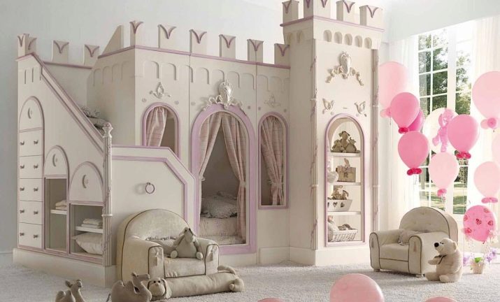 За млада принцеса леглото, направено под формата на приказен замък, е най -подходящо. Не само прости модели могат да украсят такова креватче, но и стикери или ваденки с изображения на известни принцеси на Дисни. Яслите, направени в такъв приказен стил, приятно ще зарадват вашето бебе и ще го накарат да се почувства като част от приказния свят.