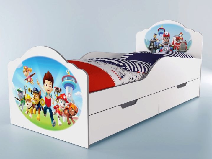 Детското креватче, украсено със симпатични кучета от анимационния филм “Лапа патрул”, изглежда много сладко. Такива щампи ще се впишат идеално в спалнята за растящо дете на възраст от четири до дванадесет години..