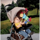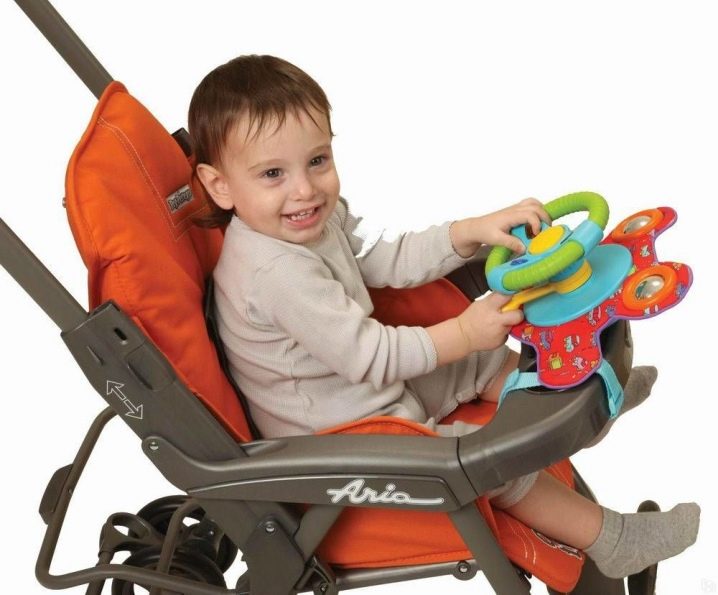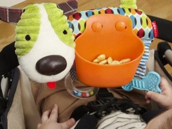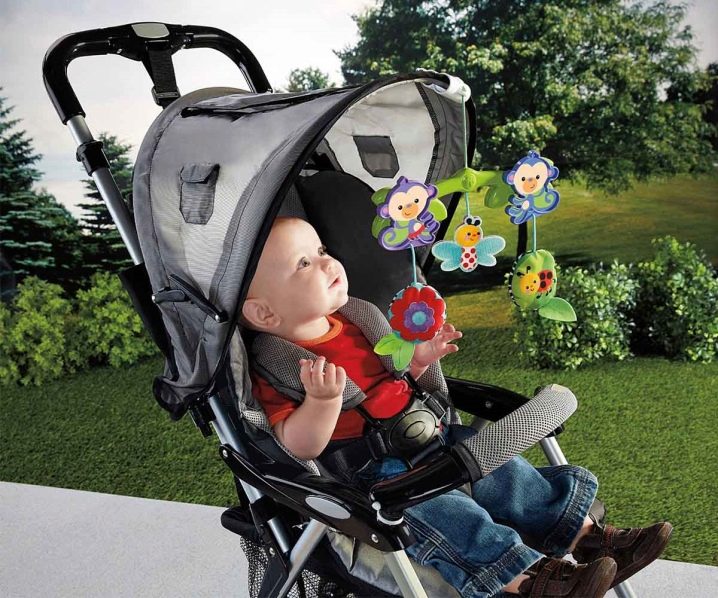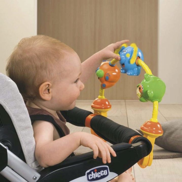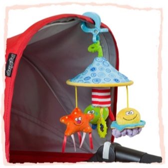 - Висулка играчка. Играчките обикновено са изработени от пластмаса или плат. Коланът е окачен от горната част на количката. Лежайки в количката, детето може да погледне цветните фигури и да посегне към играчката.