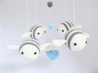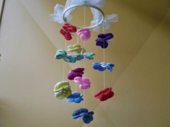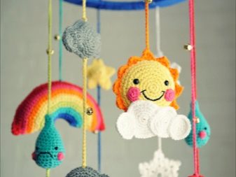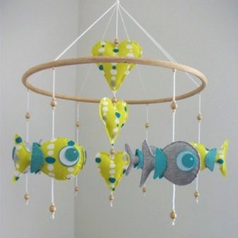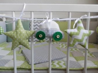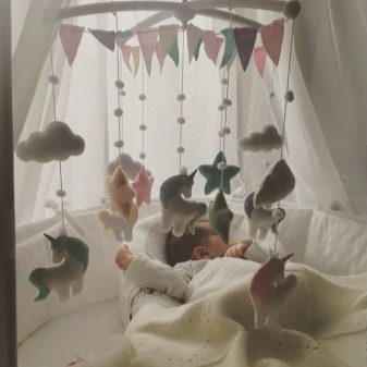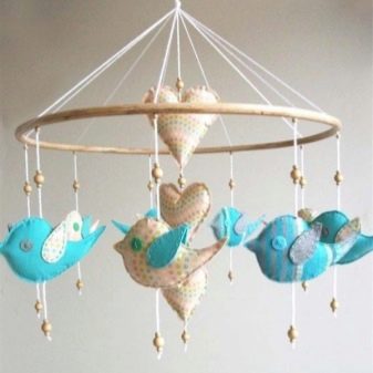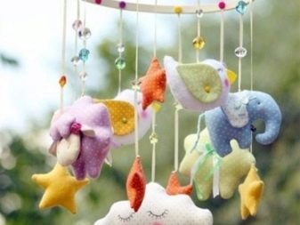- Гирлянди. Такива играчки са окачени не само на леглото на бебето, но и на количката. Играчките с гирлянди могат да бъдат изработени от пластмаса, дърво или плат..