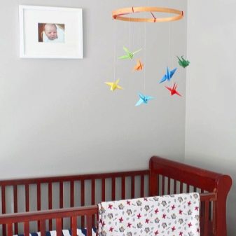 Тъй като очите на новородено все още не са напълно развити, струва си да започнете с обикновен висящ гирлянд. Гирляндата е прикрепена към страните на детското легло, съответно тя е неподвижна. Цветовете на отделните играчки не трябва да се различават драстично един от друг.. Най -добре е да дадете предпочитание на спокойните цветове, за да не натоварвате очите на бебето..