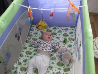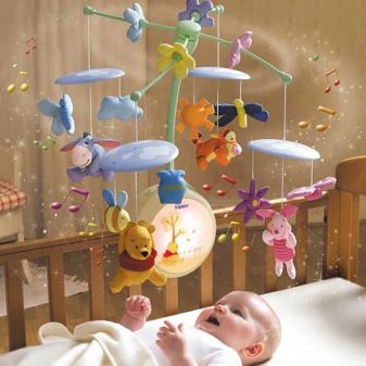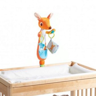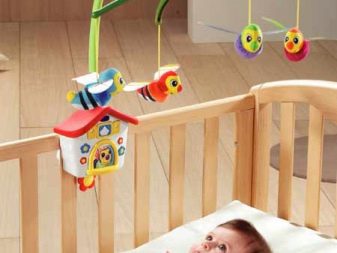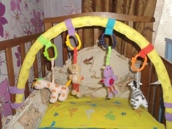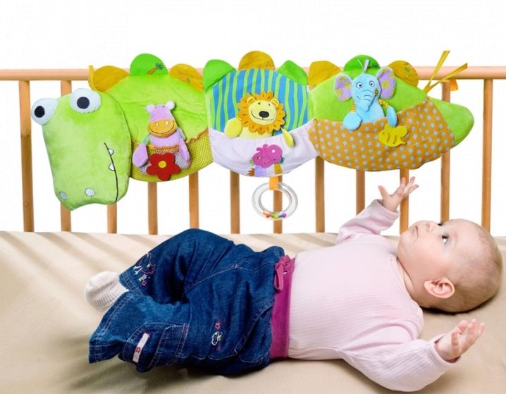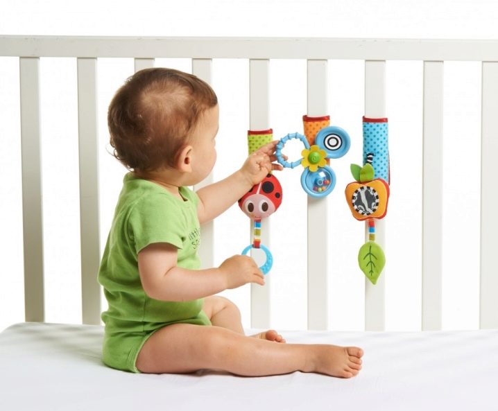 - Играчки – висулки. Такива играчки обикновено са прикрепени към страните на яслите. Играчките могат да скърцат, да дрънкат и дори да свирят приятна мелодия. Случайно докосвайки играчка, детето ще се зарадва на нови звуци и ще ги слуша, а впоследствие ще разпознава. Най-често срещаната висулка е така наречената „змия“