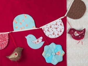 И така, вариант номер 1. Вземете плат, за предпочитане ярък, но не пъстър, и изрежете от него различни фигури, по 2 копия всяка. Това може да бъде например сърце, полумесец, кон, слънце, кръг, триъгълник, квадрат и т.н. Зашийте същите части заедно, като поставите там памучна вата. След това можете да вземете лентата, да я закачите на яслите и да завържете фигурите към нея. Така получавате домашен гирлянд..
